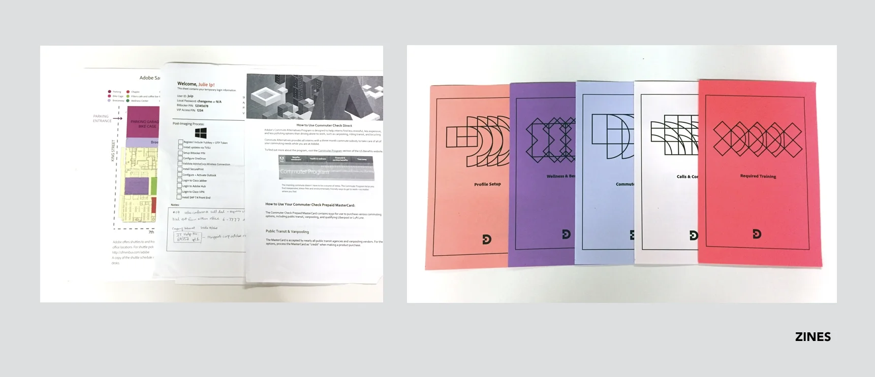 (left) Handouts with partial important information | (right) Set of zines with concise important information